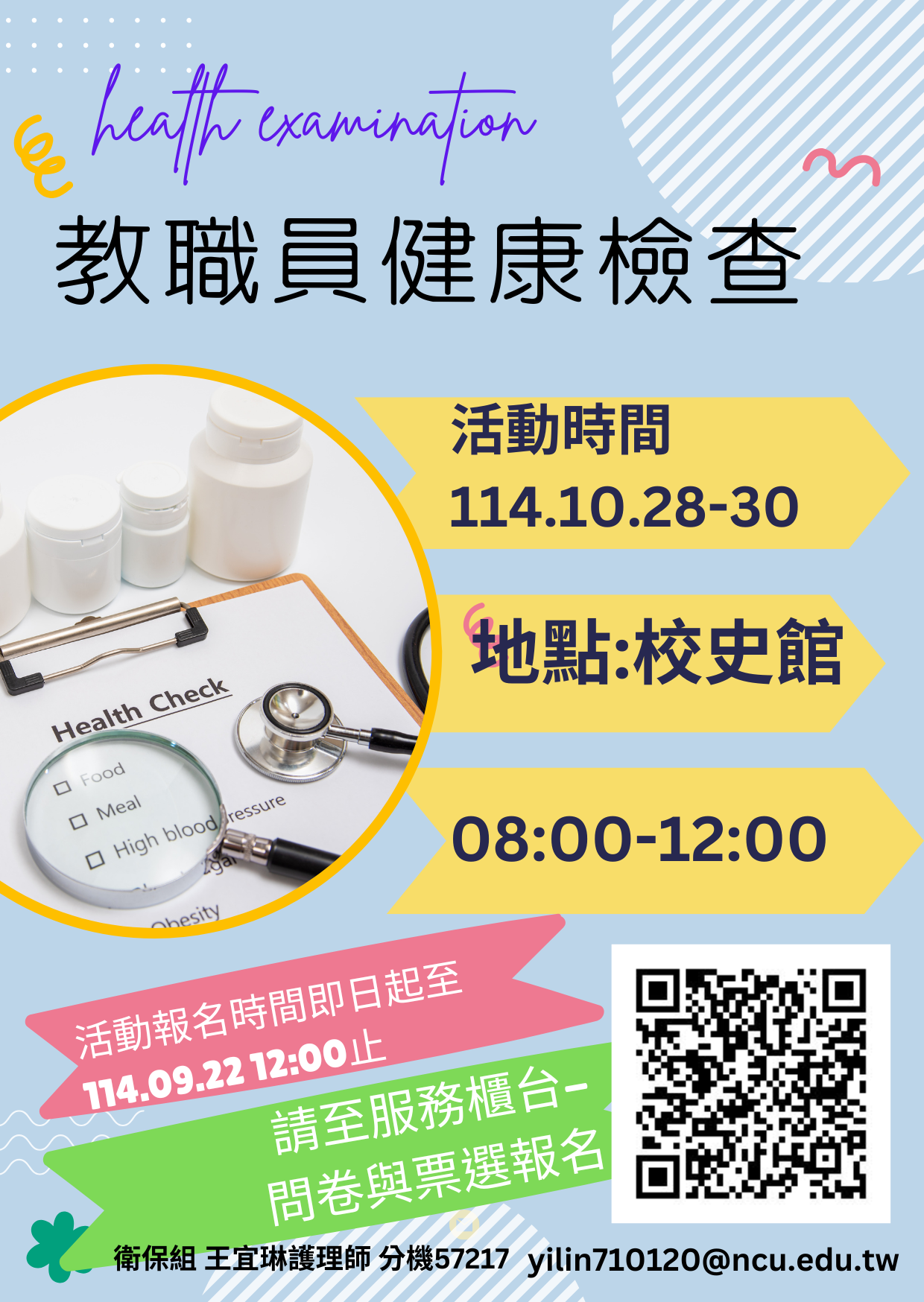 We are pleased to announce that the 2025 annual health checkup for faculty and staff will be conducted on campus in collaboration with Taipei Hong-En General Hospital. This self-funded service is open to all faculty and staff. Newly appointed personnel without a pre-employment physical may also register for a general checkup at a cost of NT$250. For further inquiries, please contact our office.