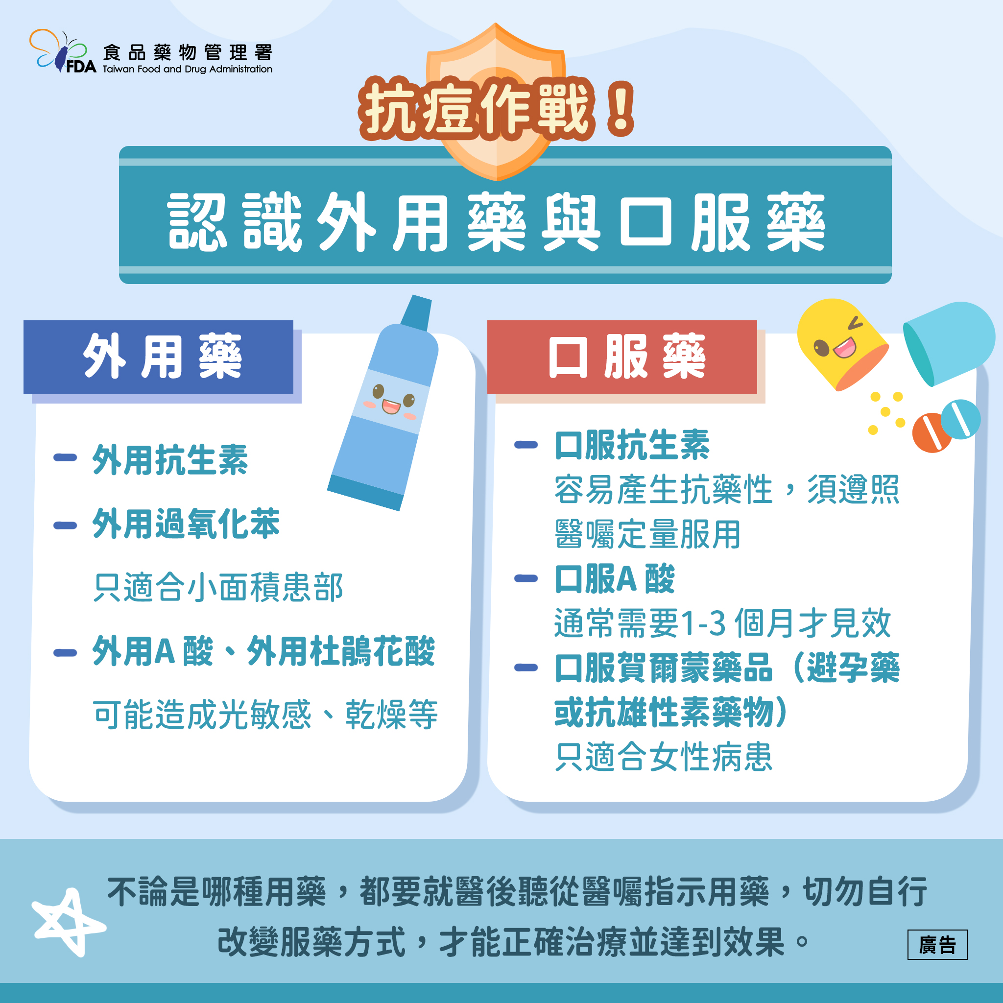 食藥署提醒民眾,若有嚴重的青春痘問題,最好還是請教專業醫師,而且遵循醫囑、正確用藥,才是「還你漂亮臉」的最佳解決之道。