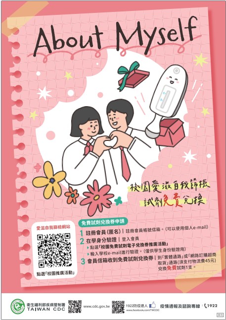 衛生福利部疾病管制署推動「校園自我在家篩檢試劑免費兌換活動」,鼓勵高級中等學校以上在學學生進行匿名自我篩檢,以早期了解自身健康狀況,強化防治觀念。