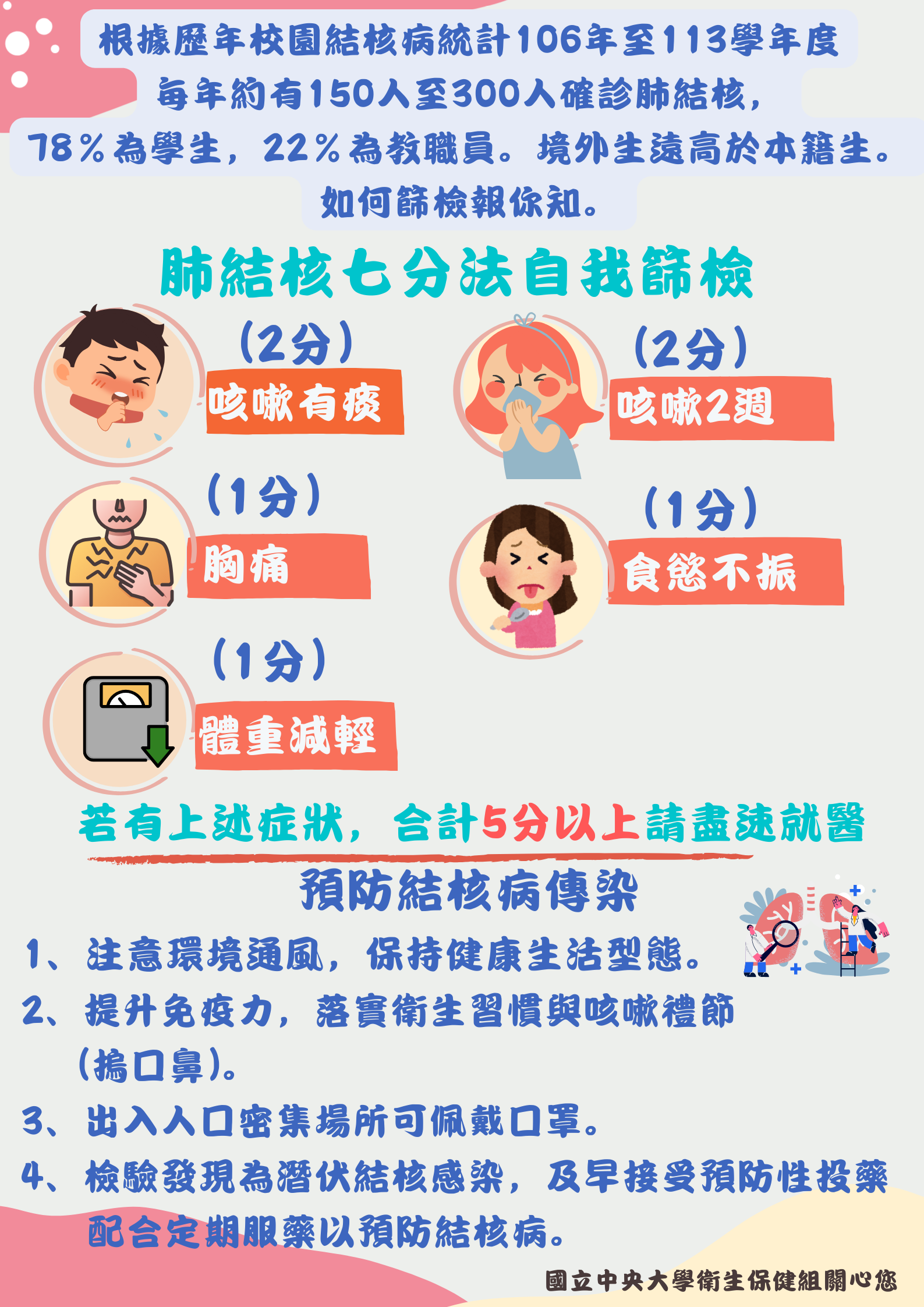 此封訊息主要提醒大家注意肺結核可能相關症狀,若有相關症狀,請依海報進行自我篩檢,並依需求盡早就醫。
