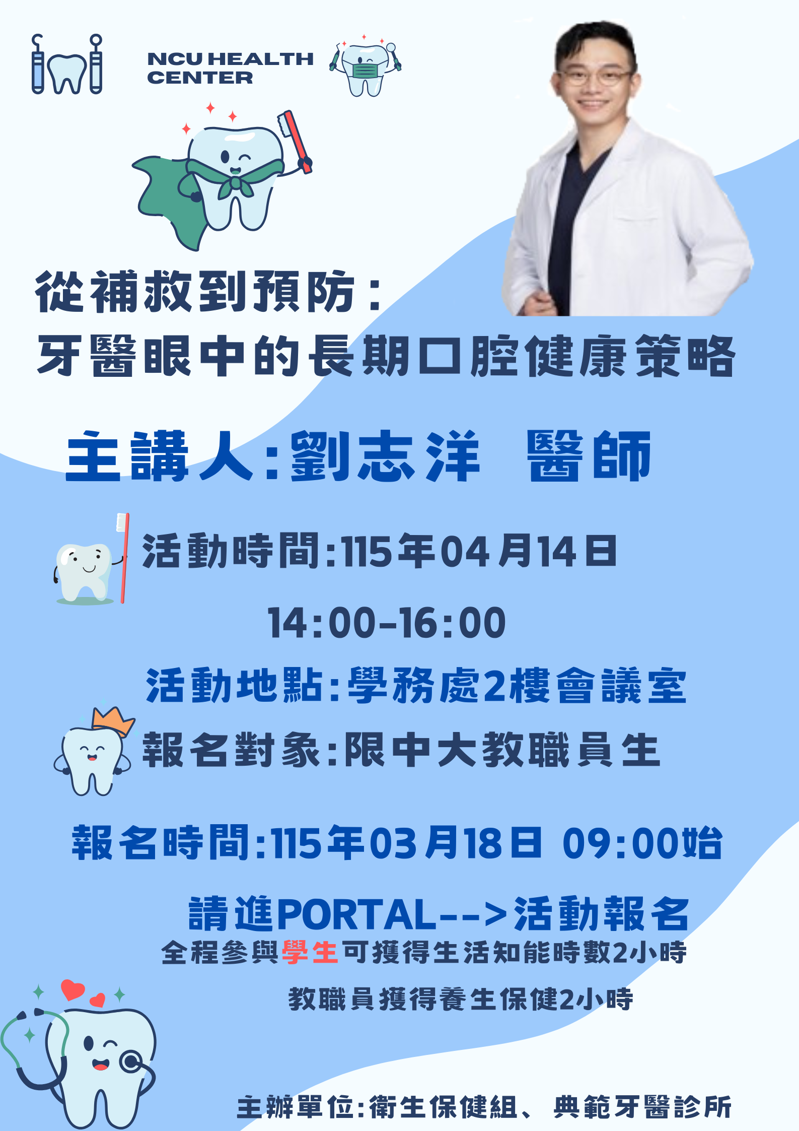 透過輕鬆易懂的方式,幫助同學建立正確的口腔保健習慣,了解如何在忙碌的學習與生活中做好牙齒照護,預防蛀牙與牙周問題。讓我們一起從現在開始,養成良好的口腔保健習慣,守護健康笑容,遠離牙齒困擾!🦷