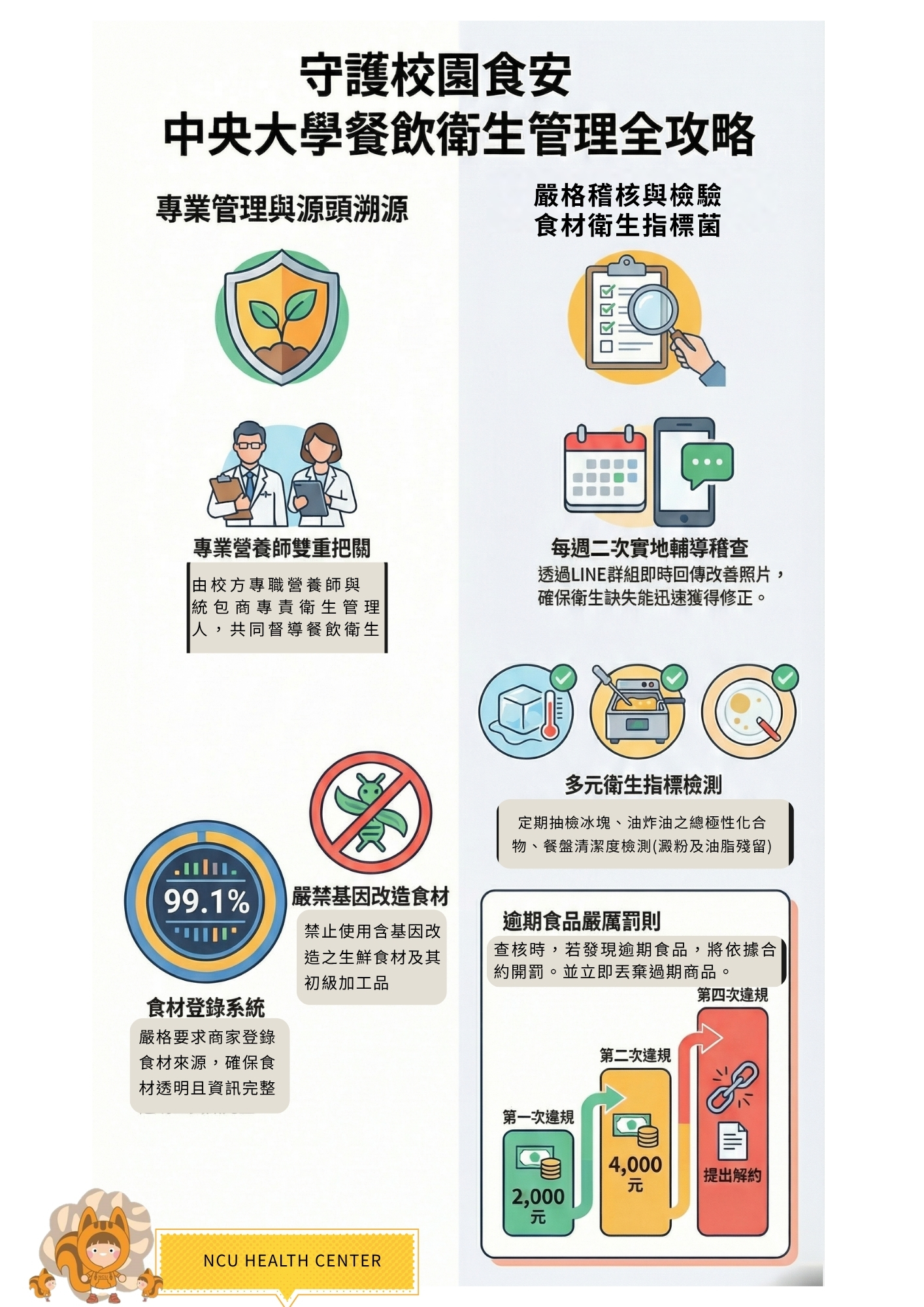 本校持續推動校園餐廳食品安全管理,從食材來源查核、製程衛生,到定期稽查與輔導,層層把關每一道餐點品質,讓大家能夠吃得安心、吃得放心!