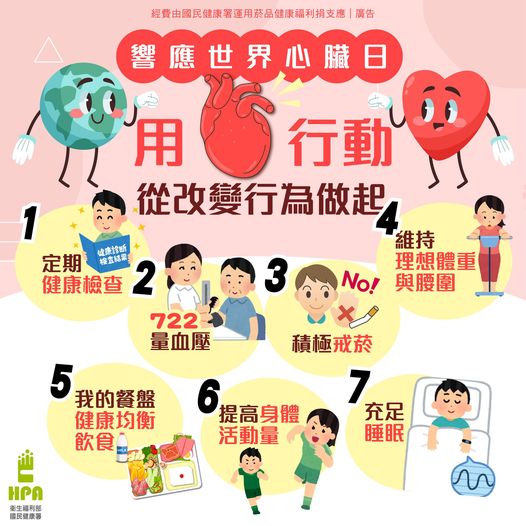 世界心臟聯盟(World Heart Federation)訂定每年9月29日為「世界心臟日」,今年以「用『心』行動』 (Use heart for action)」為主題,發起網路連署、貼文及健走競賽活動,強化全球對於心血管健康的重視及參與。為響應世界心臟日,國民健康署吳昭軍署長呼籲民眾應定期健康檢查,並建立良好的生活習慣,為自己的心血管健康積極行動。